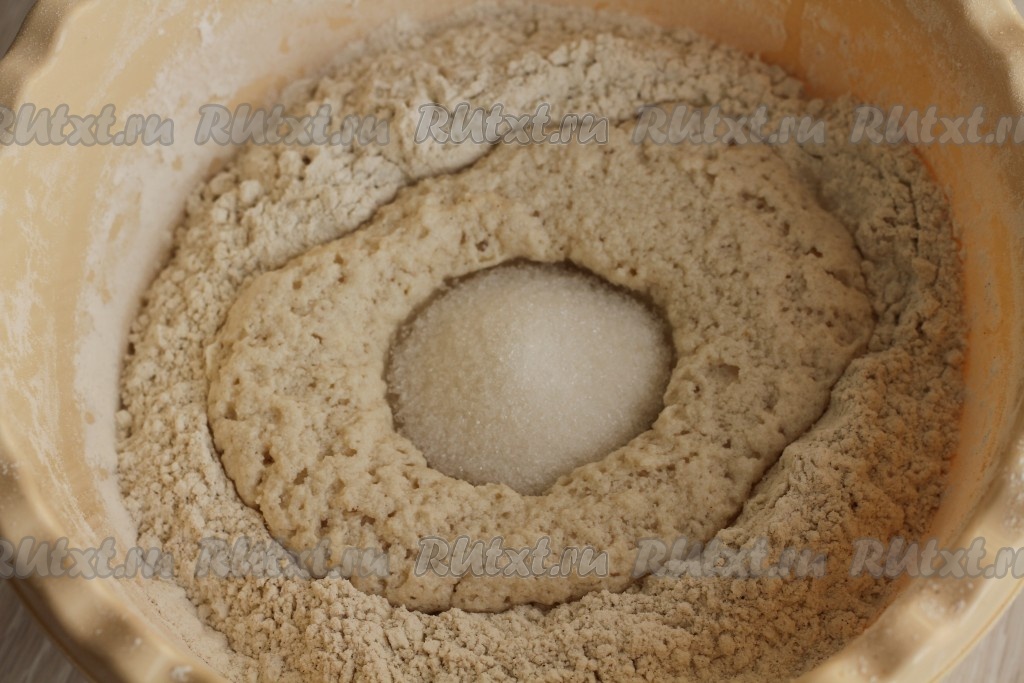 Сделать углубление в середине мучной смеси и влить туда подошедшие дрожжи, добавить оставшийся сахар.