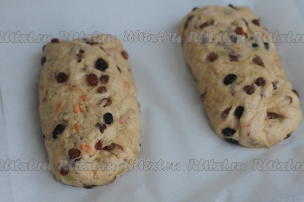 Снова придать тесту прямоугольную форму, отступить 1/3 от края пласта и сделать в тесте углубление, проведя борозду ребром ладони. Сложить тесто по этому углублению, то есть большую часть теста складываем до углубления края теста, немного формируем и округляем. Теперь на противень, застеленный 3 листами пергаментной бумаги, перенести штоллен, накрыть пленкой и оставить его на 30 минут на расстойку.
