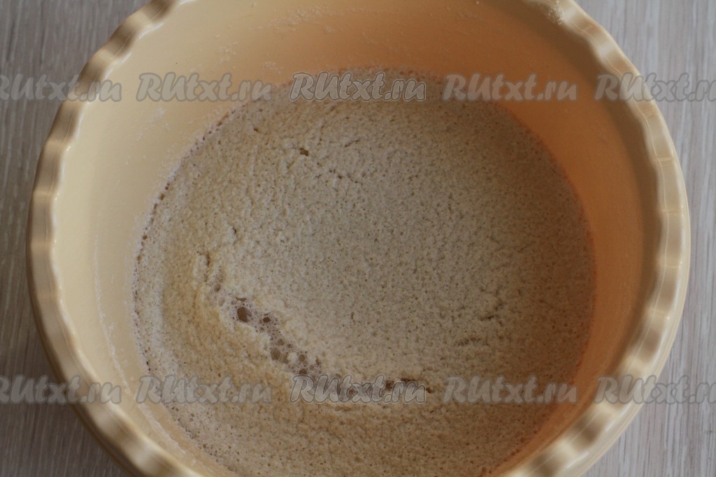 Подготовить опару, для этого дрожжи развести в теплом молоке, добавить 2-3 столовые ложки сахара, хорошо размешать, присыпать мукой и оставить на 15-20 минут в теплом месте.