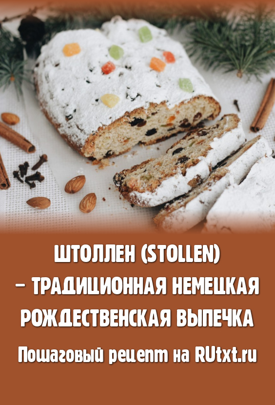 Штоллен (нем. Stollen или нем. Christstollen) - традиционная немецкая рождественская выпечка. Чаще всего штоленны выпекают с начинкой из цукатов и изюма, хотя популярны и варианты с орехами, маком или марципаном. Для этой выпечки готовится тяжёлое дрожжевое тесто, при этом должны соблюдаться определенные пропорции. Эта выпечка достаточно символична, своей формой и белым цветом она «напоминает» завёрнутого в пелёнки Христа-младенца. Выпекаются штоллены заранее, иногда за месяц до Рождества, и в прохладном месте могут храниться 2-3 месяца.