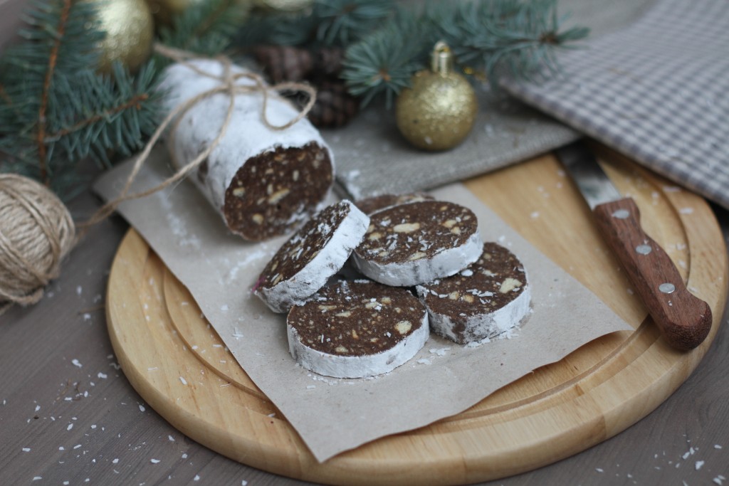Шоколадную колбасу, приготовленную со сгущёнкой из печенья и какао, перед подачей обсыпать сахарной пудрой, а затем нарезать на кружочки и подать к столу. Этот домашний десерт навевает мне воспоминания о детстве и всегда радует отменным вкусом!