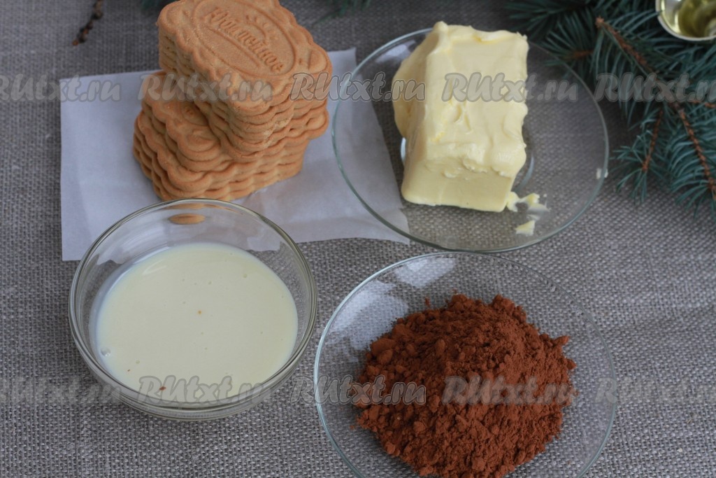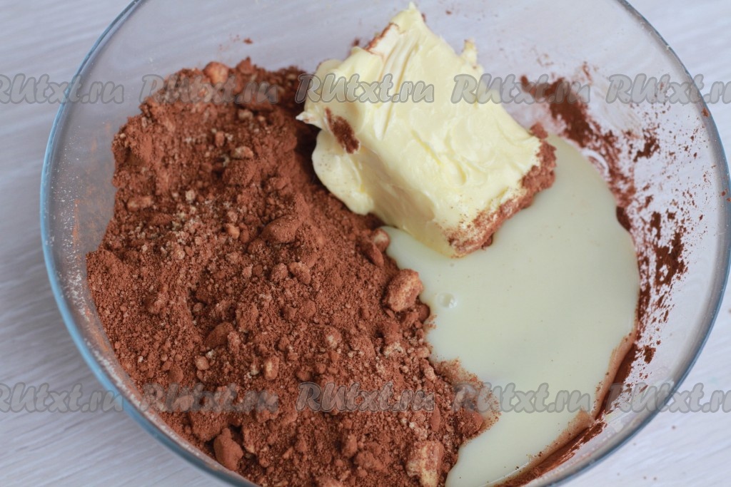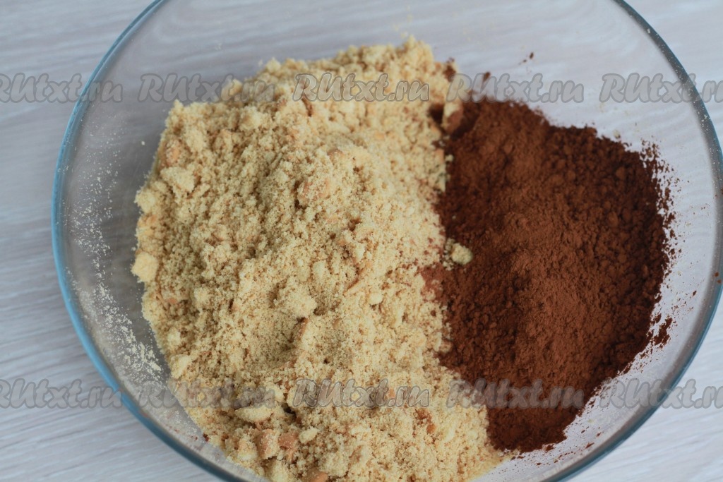 Половину печенья измельчить в блендере в крошку, другую часть поломать на мелкие кусочки. Переложить всё печенье в объёмную миску. К печенью всыпать какао, тщательно перемешать.