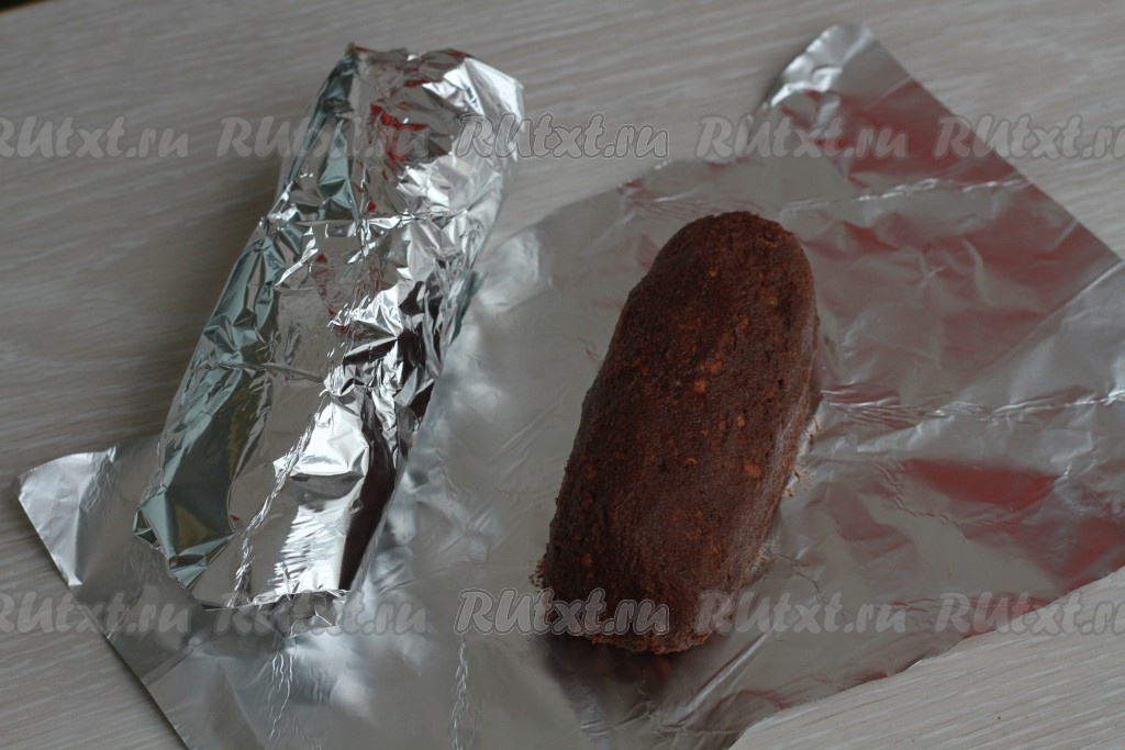 Разделить массу на 2 части. Из каждой части сформировать шоколадную колбасу. Завернуть каждую колбаску в фольгу и убрать в холодильник до застывания (как минимум на 2-3 часа).
