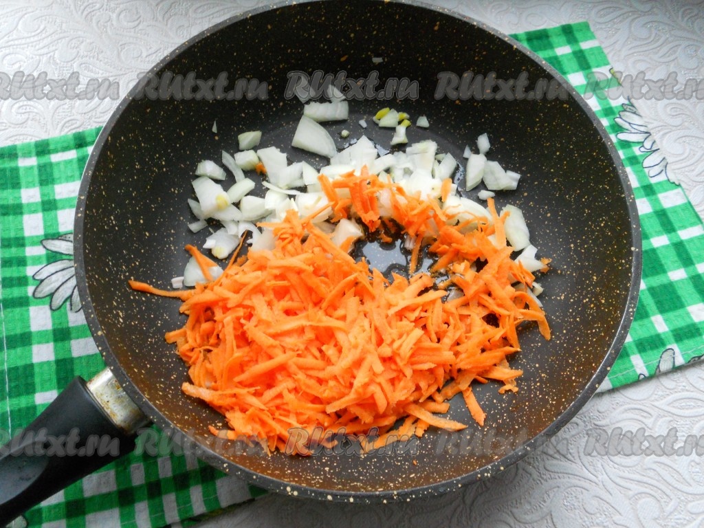 Лук репчатый нарезать кусочками, морковь натереть на крупной терке и выложить в глубокую сковороду, влить растительное масло и обжарить до мягкости, иногда помешивая.