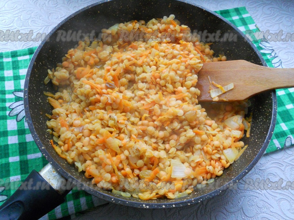 Добавить чечевицу, порошок карри, черный свежемолотый перец и промытый изюм в сковороду к обжаренным овощам.