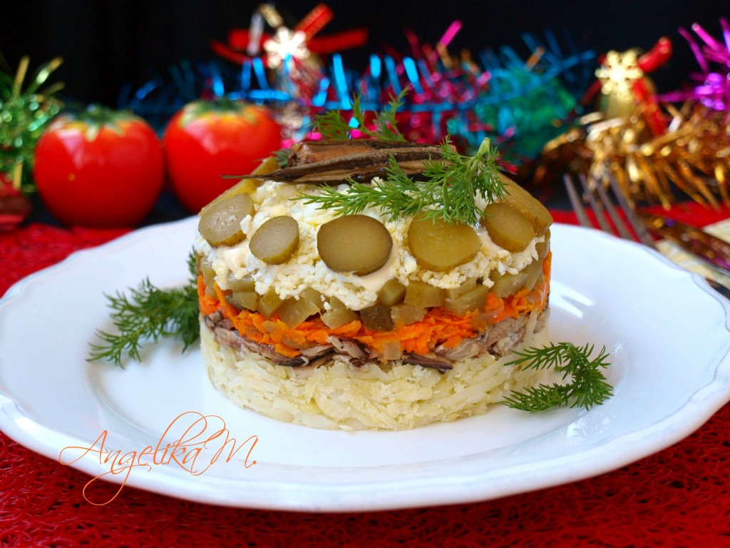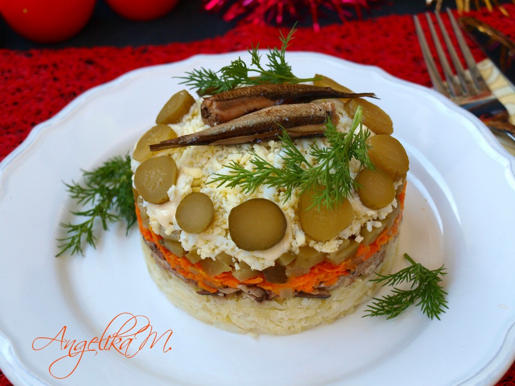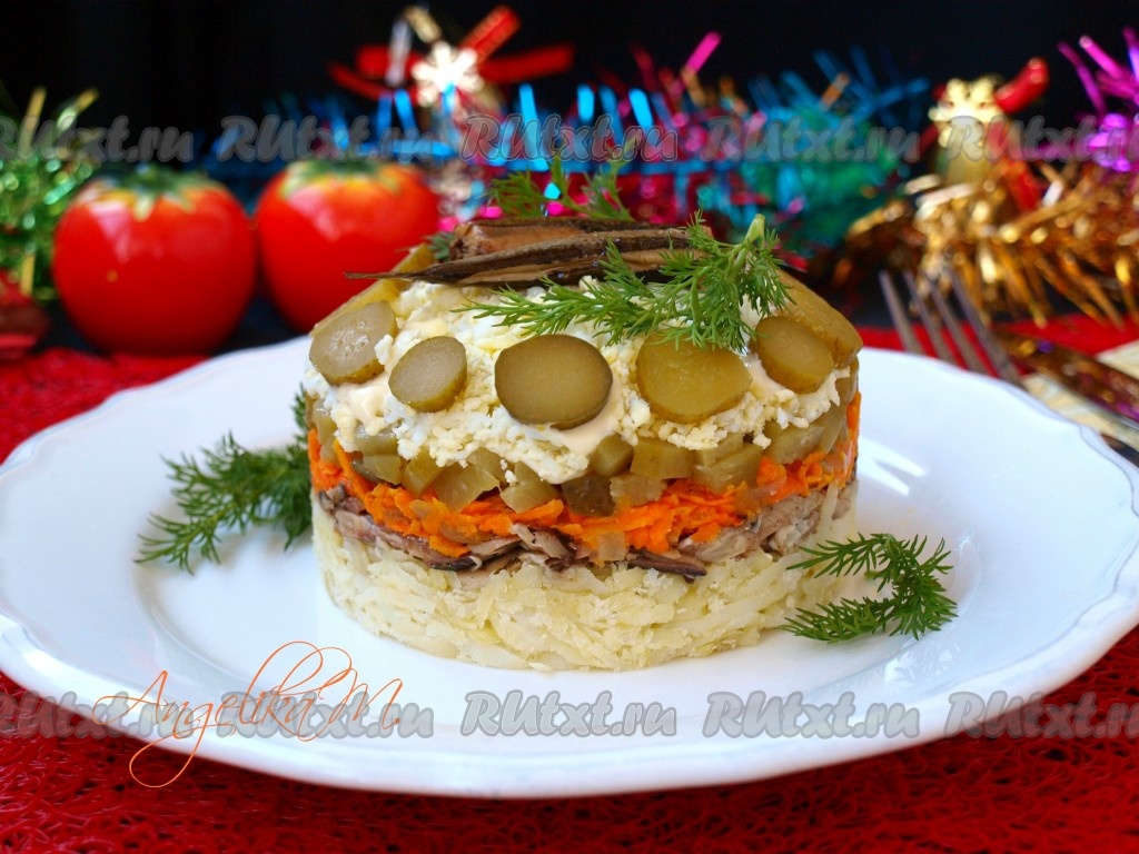 Верх салат оформить по своему вкусу. Невероятно вкусный и красивый салат из шпрот с картофелем, выложенный слоями, подать к праздничному столу.