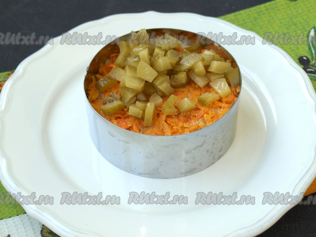 Выложить сверху шпрот лук с морковью, затем - нарезанные кубиками огурцы. Между этими слоями майонез не нужен.