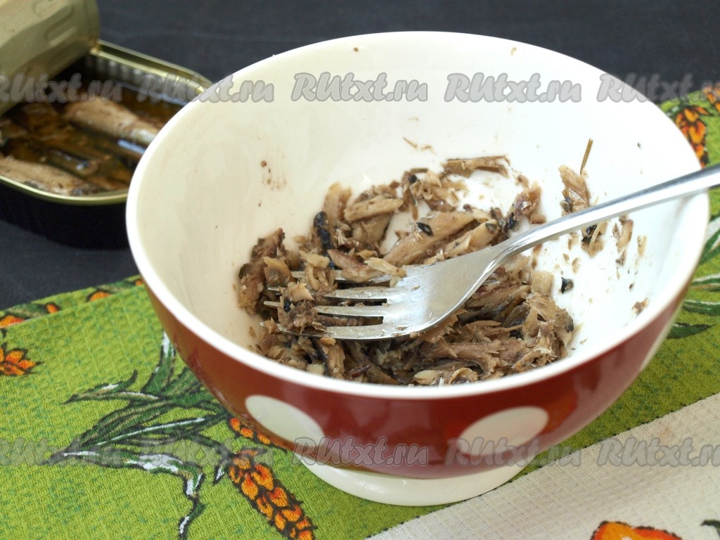 Шпроты переложить в пиалу без масла, размять вилкой.