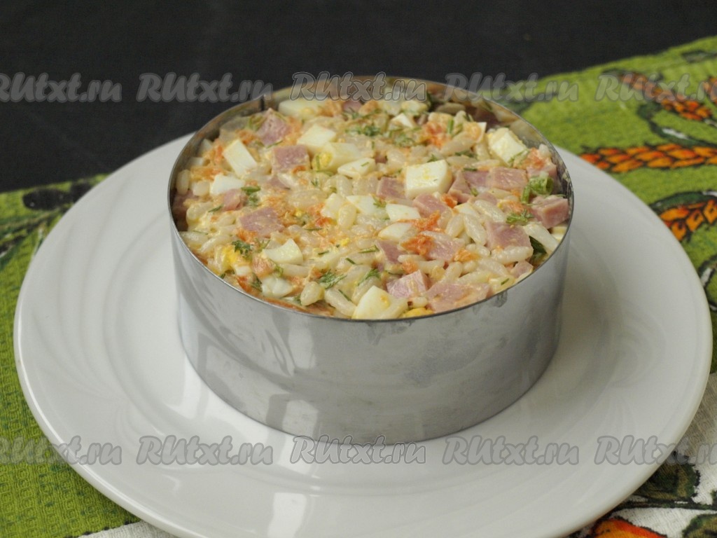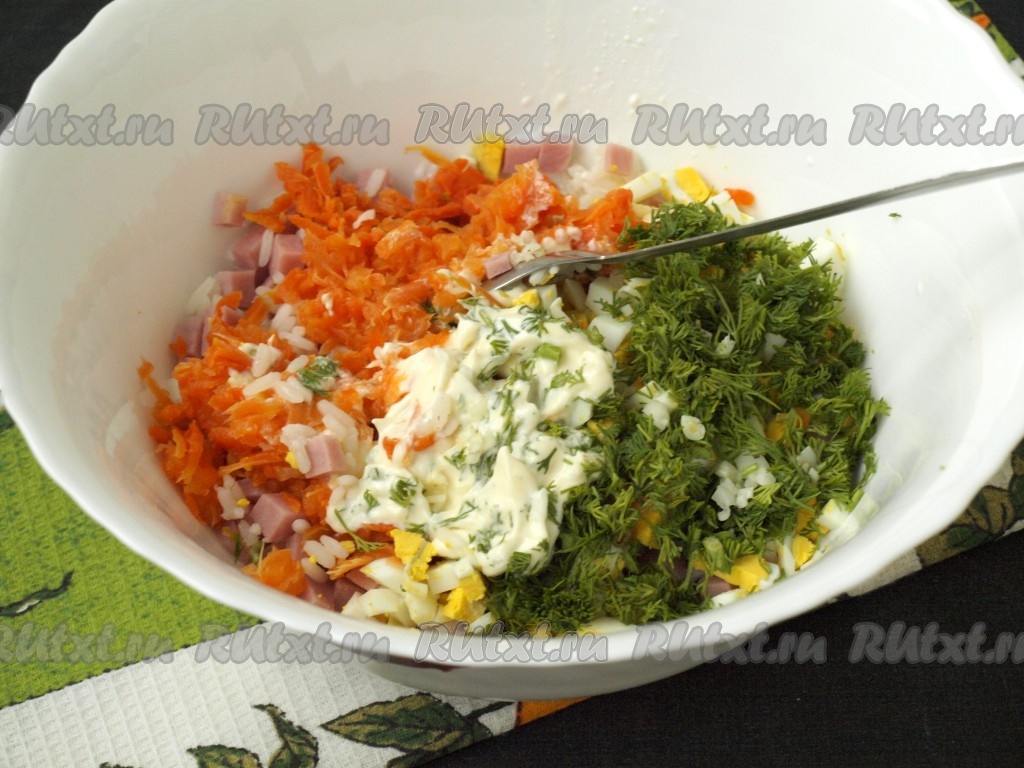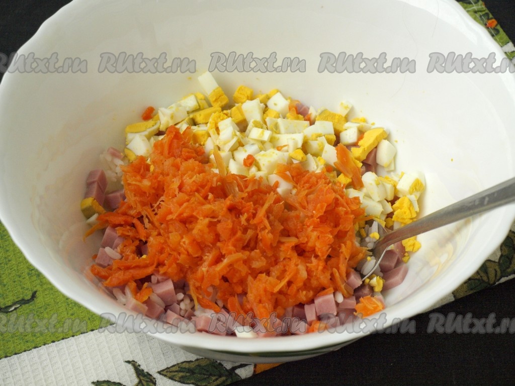 Очищенные яйца нарезать кубиками, морковь натереть на тёрке и добавить их в салат к ветчине и рису.