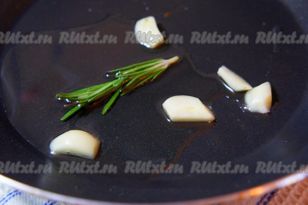 Очищенный чеснок нарежьте на пластины. Масло нагрейте на сковороде, выложите пластины чеснока и розмарин, прогрейте 1-2 минуты на среднем огне. Затем уберите чеснок и розмарин со сковороды. Ароматное масло для жарки свиных стейков на кости готово!