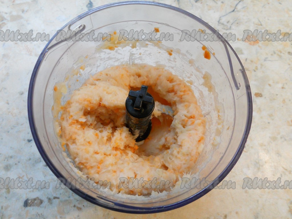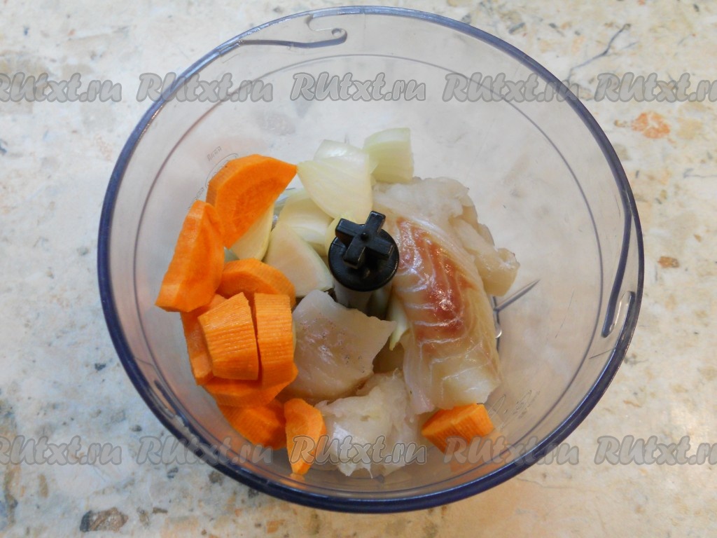 Кусочки филе рыбы, нарезанные лук и морковь поместить в чашу блендера.