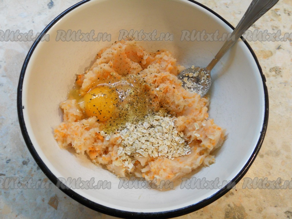 Получившийся рыбный фарш выложить в миску, добавить овсяные хлопья, яйцо, соль и перец.