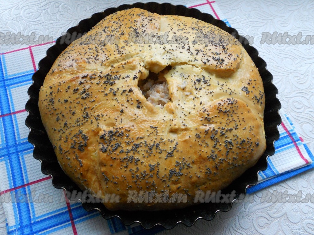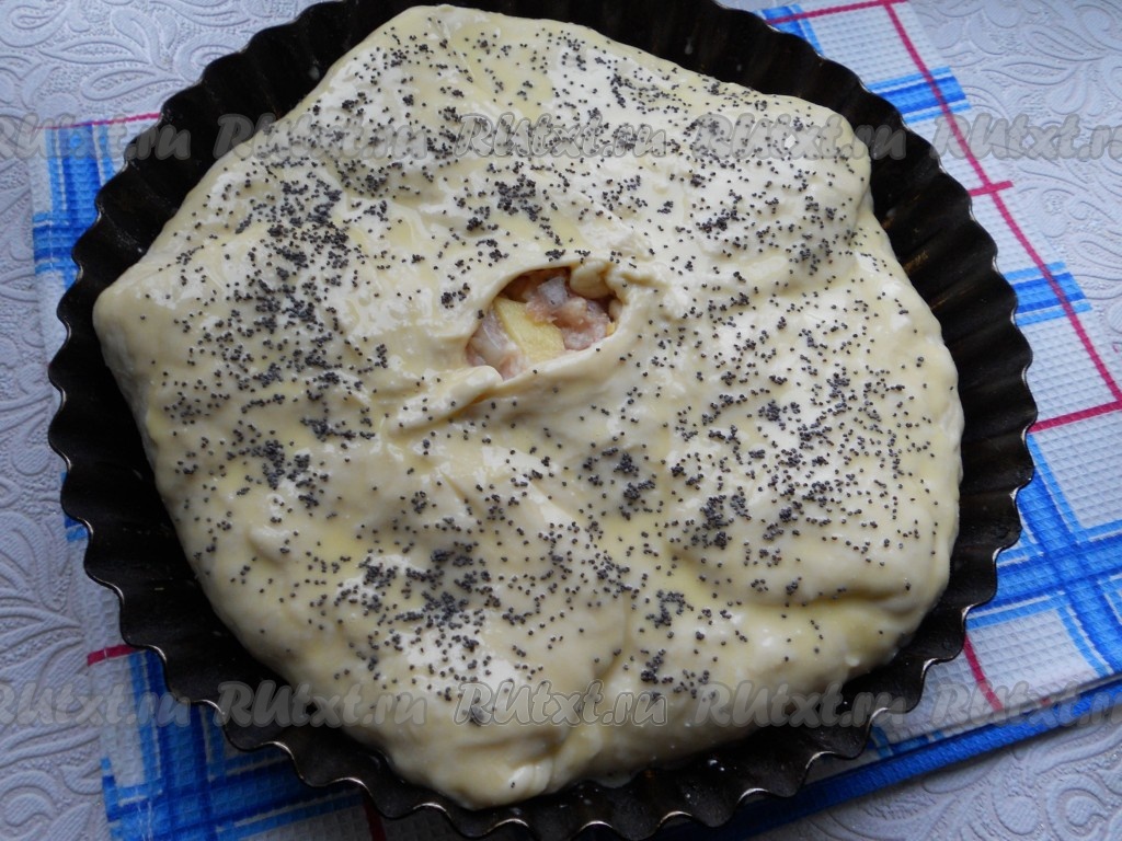 Затем свисающими краями теста накрыть начинку, оставив в середине небольшое отверстие для выхода пара. Смазать пирог желтком и посыпать маком или кунжутом.