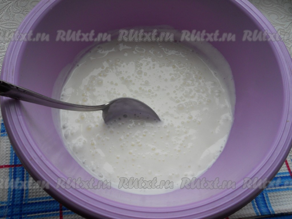 В кефир комнатной температуры добавить соду, перемешать и оставить на 15 минут. Сода должна погаситься, появятся пузырьки.
