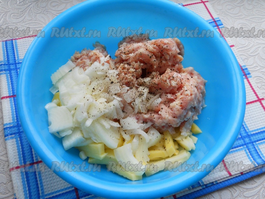 Приготовить начинку для пирога: картофель очистить и нарезать соломкой, добавить фарш и нарезанный кусочками репчатый лук, посолить, поперчить, перемешать.