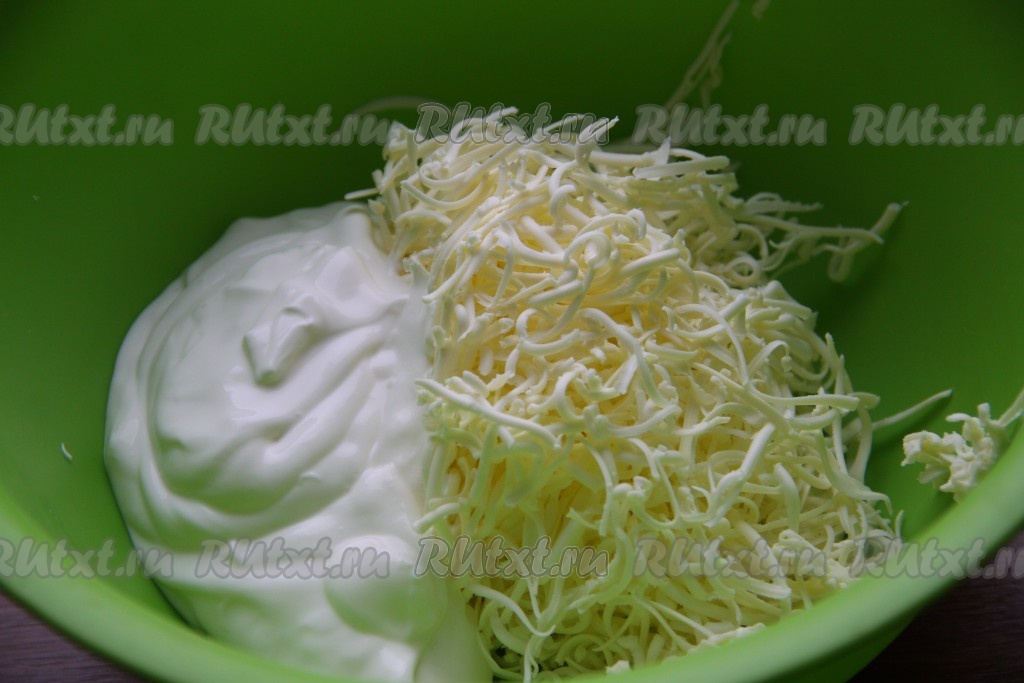Прежде всего замесим тесто, для этого в глубокую миску выкладываем сметану, добавляем холодное сливочное масло (масло должно быть из холодильника), натёртое на крупной тёрке.