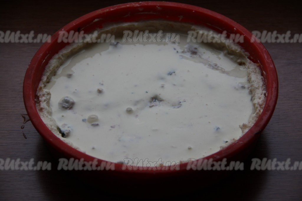 Для приготовления заливки взбиваем яйца, добавляем сметану, соль, муку и перемешиваем. Выливаем заливку на начинку и равномерно распределяем.
