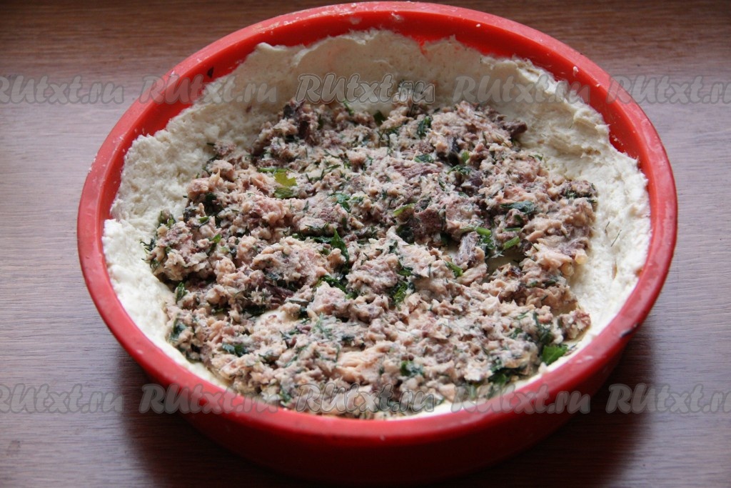 Для приготовления начинки рыбные консервы из банки без масла выкладываем на отдельную тарелку, удаляем косточки. Разминаем рыбу вилкой и смешиваем с мелко нарезанной зеленью. Получившуюся начинку равномерно выкладываем на тесто.