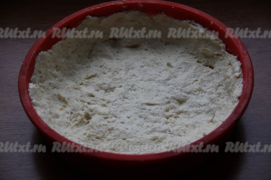 Форму для выпечки (у меня форма диаметром 22 сантиметра) немного смазываем растительным (или сливочным) маслом, затем выкладываем охлаждённое тесто, равномерно распределяем по дну формы, делаем бортики.