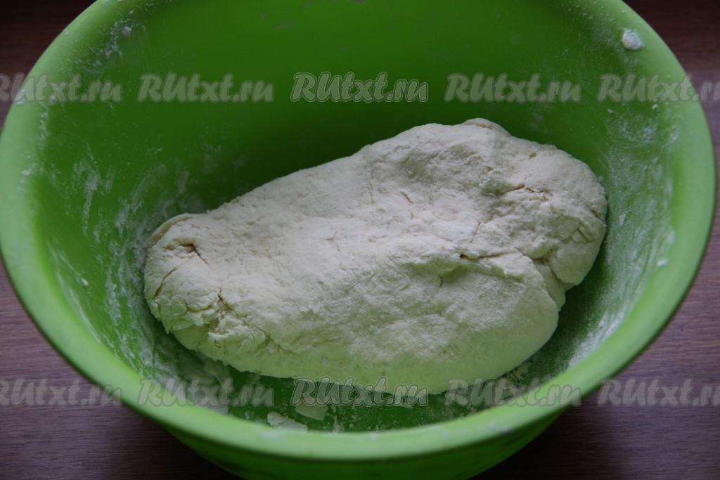 В эту же миску всыпаем 100 грамм муки, соль и разрыхлитель, начинаем замешивать тесто, подсыпая по мере необходимости оставшуюся муку. В процессе добавления муки тесто должно собраться в шар, но при этом остаться мягким. Не стоит забивать его лишней мукой. Заворачиваем тесто в целлофановый пакет и убираем в холодильник на 20 минут.