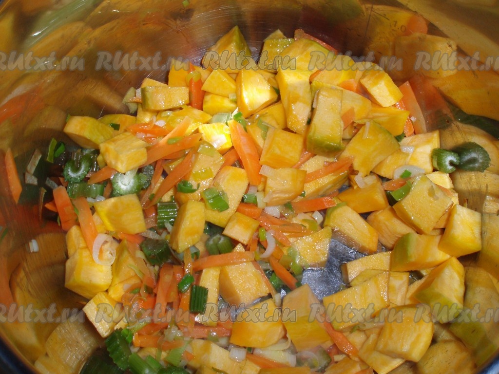 Добавить тыкву, нарезанный сельдерей и продолжать обжаривание при помешивании в течение минут 5.