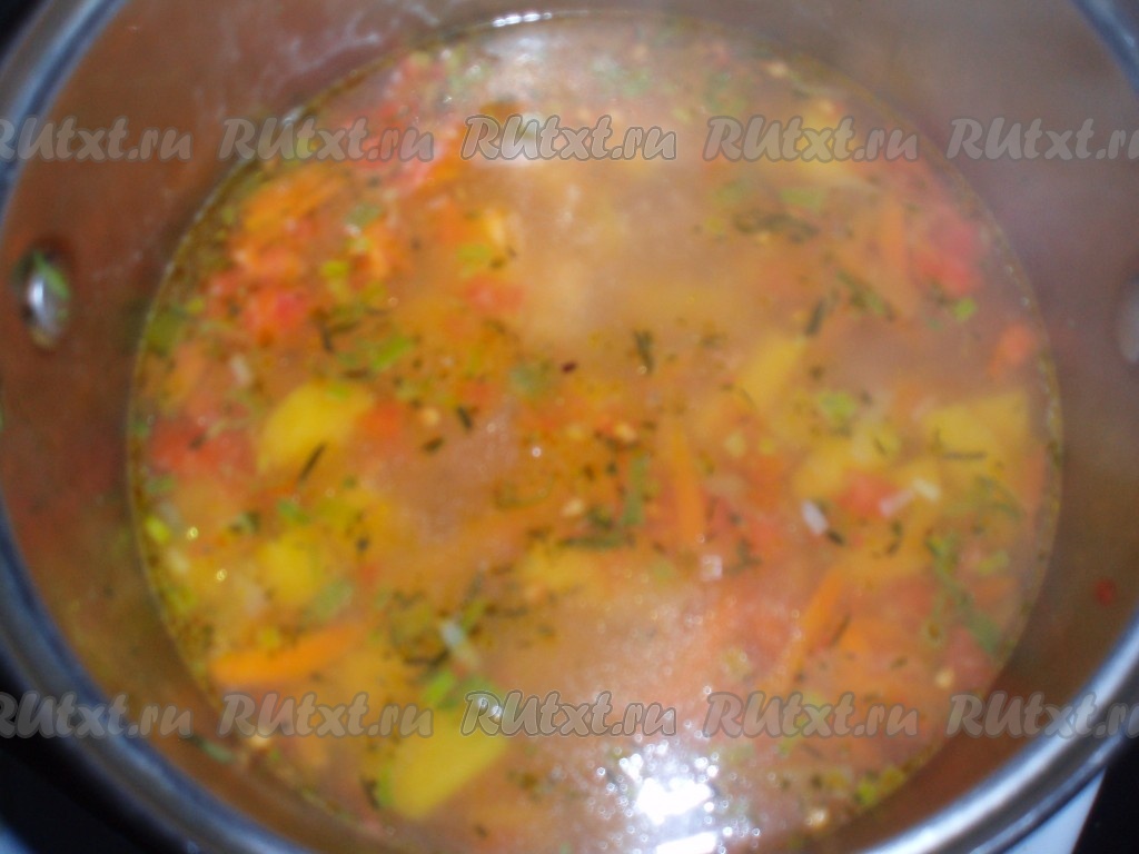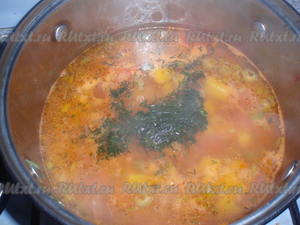 Выключить плиту. Добавить измельченную зелень и дать супу настояться.