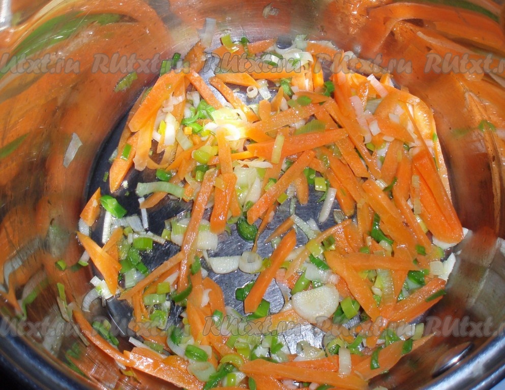 Лук порей хорошо промыть, нарезать полукольцами, чеснок измельчить. Морковь нарезать соломкой. Тыкву нарезать кубиками.