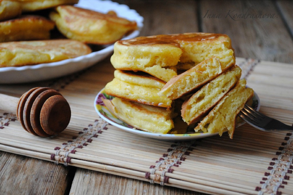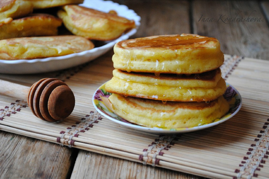 Подать такие оладушки можно с мёдом и чашечкой ароматного чая.