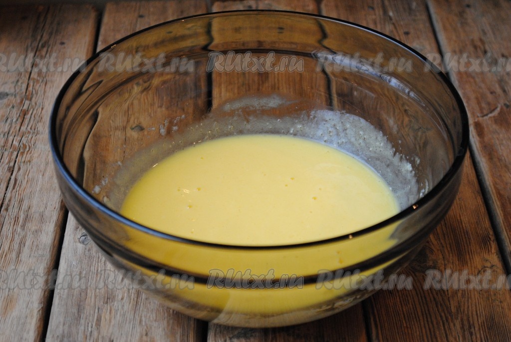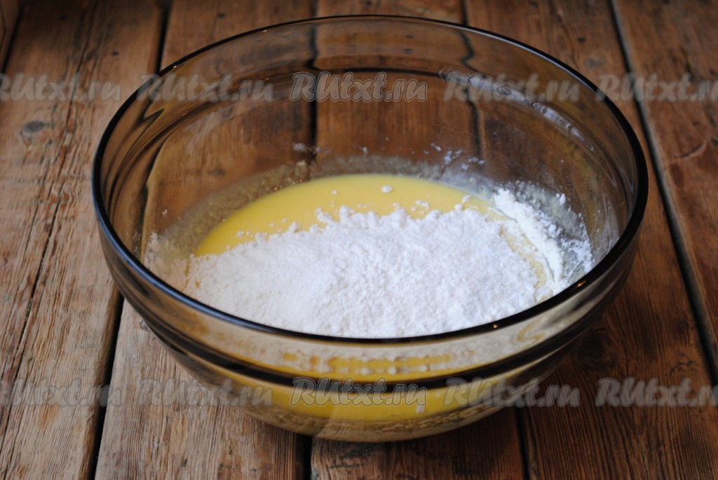 Порциями всыпать просеянную муку. Перемешать, чтобы не было комочков.