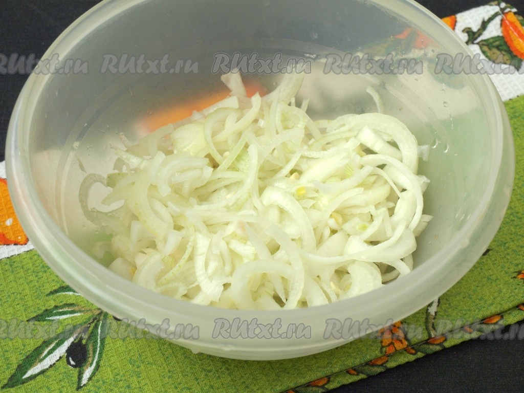Лук нарезать полукольцами, сложить в миску и замариновать в смеси уксуса и воды на 1 час.