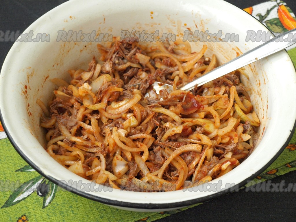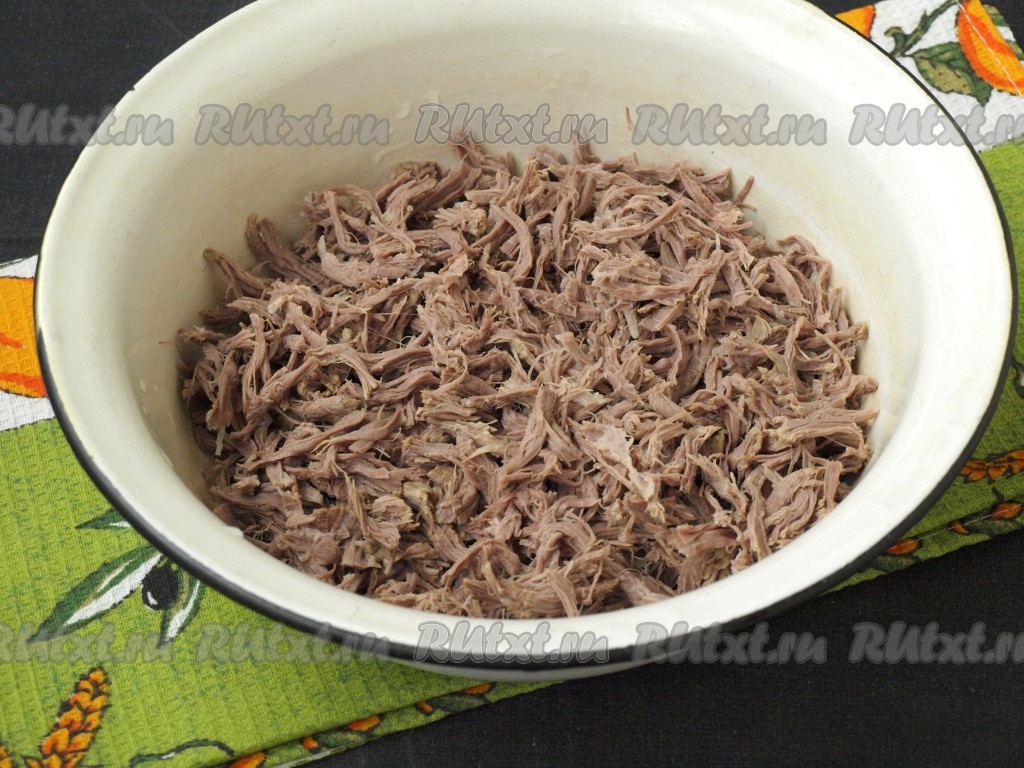 Говядину сварить в подсоленной воде до готовности (в течение 1,5-2 часов). Лучше это сделать заранее, чтобы мясо остыло и его можно было свободно брать руками. Говядину следует разобрать на волокна, сложить в миску.