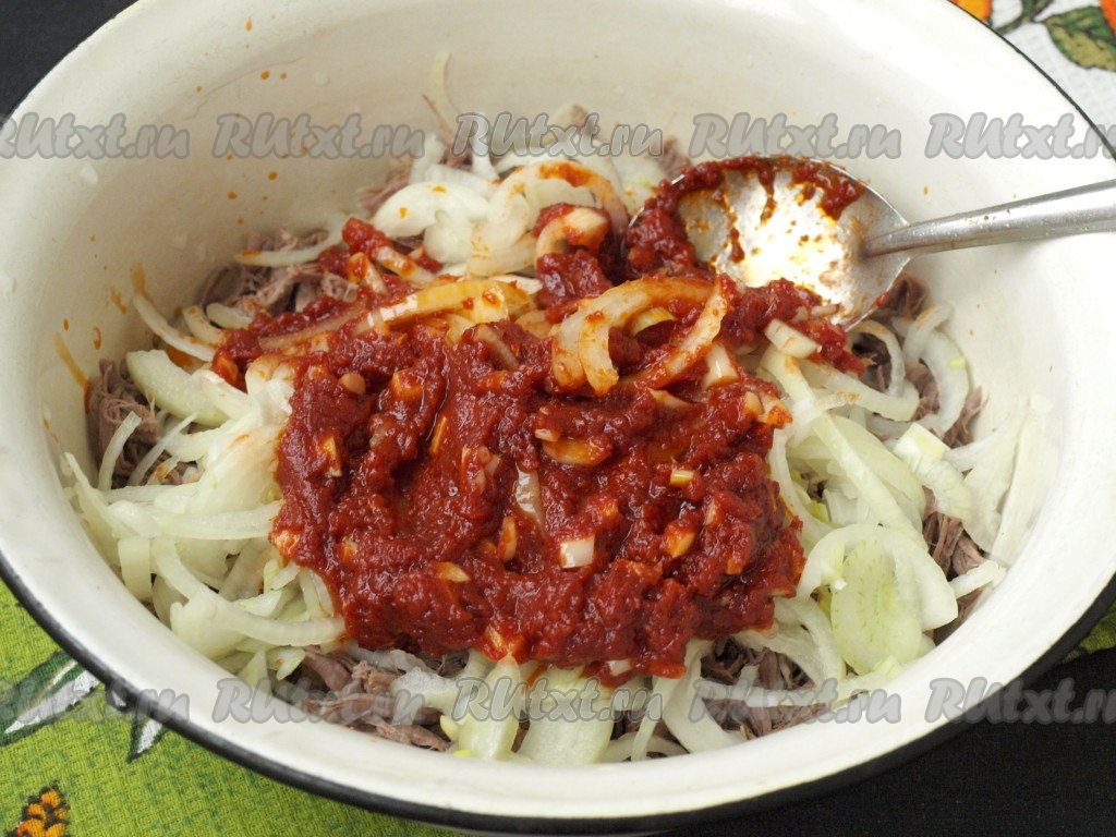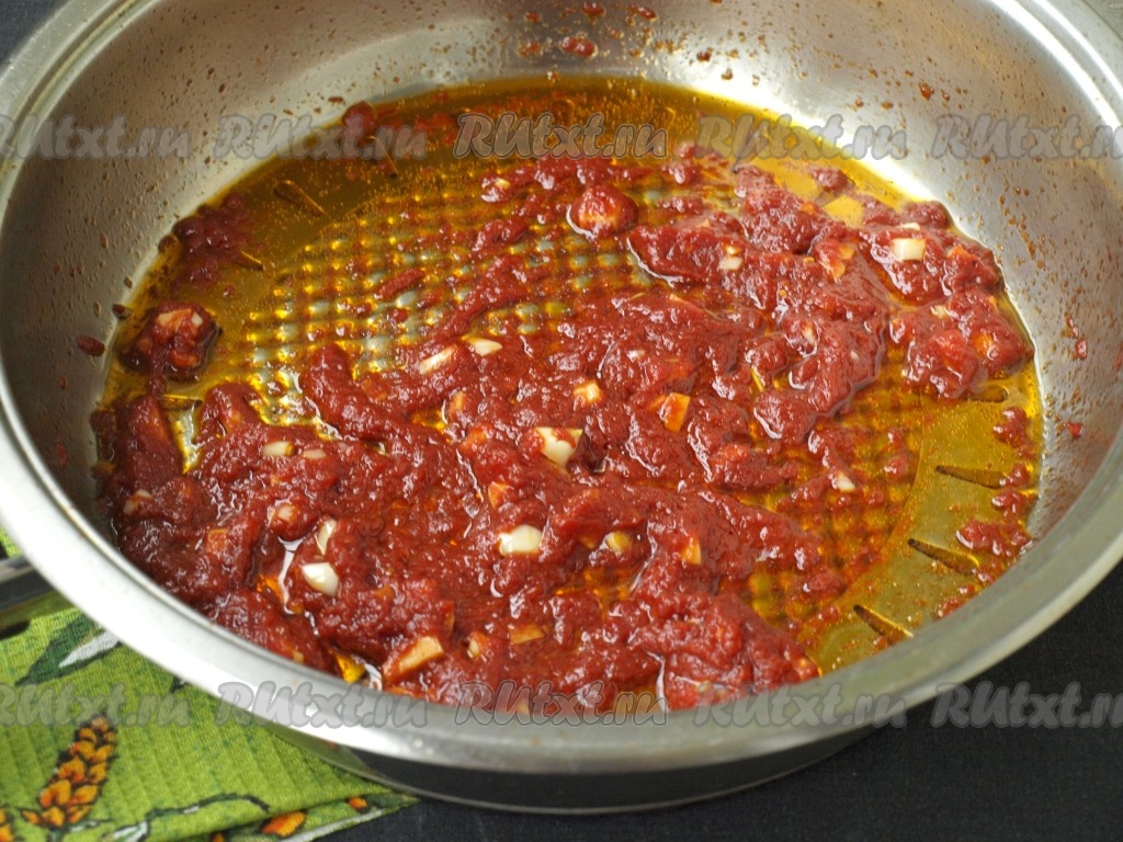 Когда лук замаринуется, можно готовить заправку для салата. В сковороде хорошо разогреть масло и выложить томатную пасту, обжаривать 4-5 минут. Затем чеснок, нарезанный кубиками, добавить в сковороду, жарить ещё пару минут, иногда помешивая.