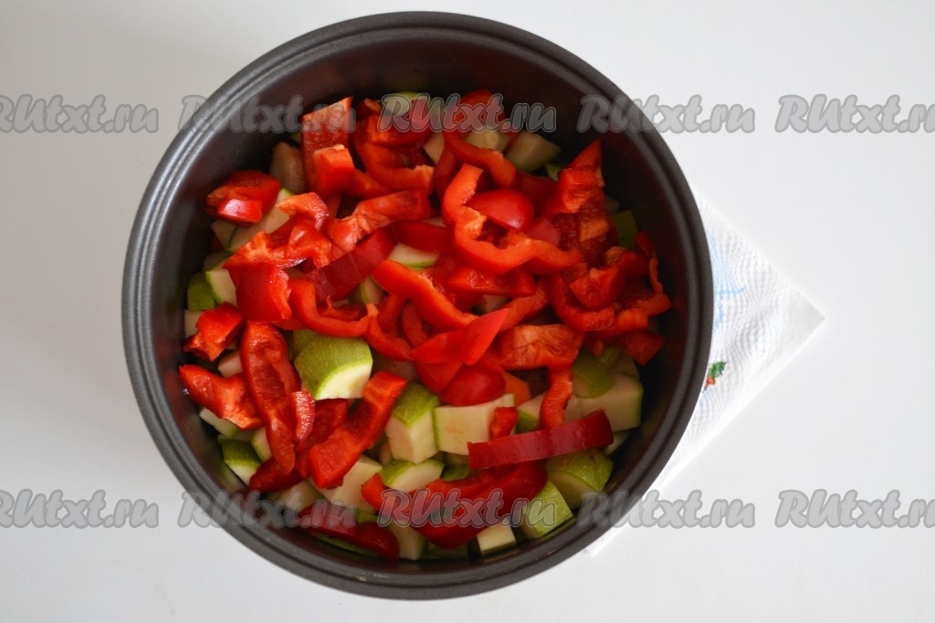 Перец вымыть, удалить семена и плодоножку, нарезать соломкой и выложить к другим овощам и куриным голеням в чашу мультиварки.