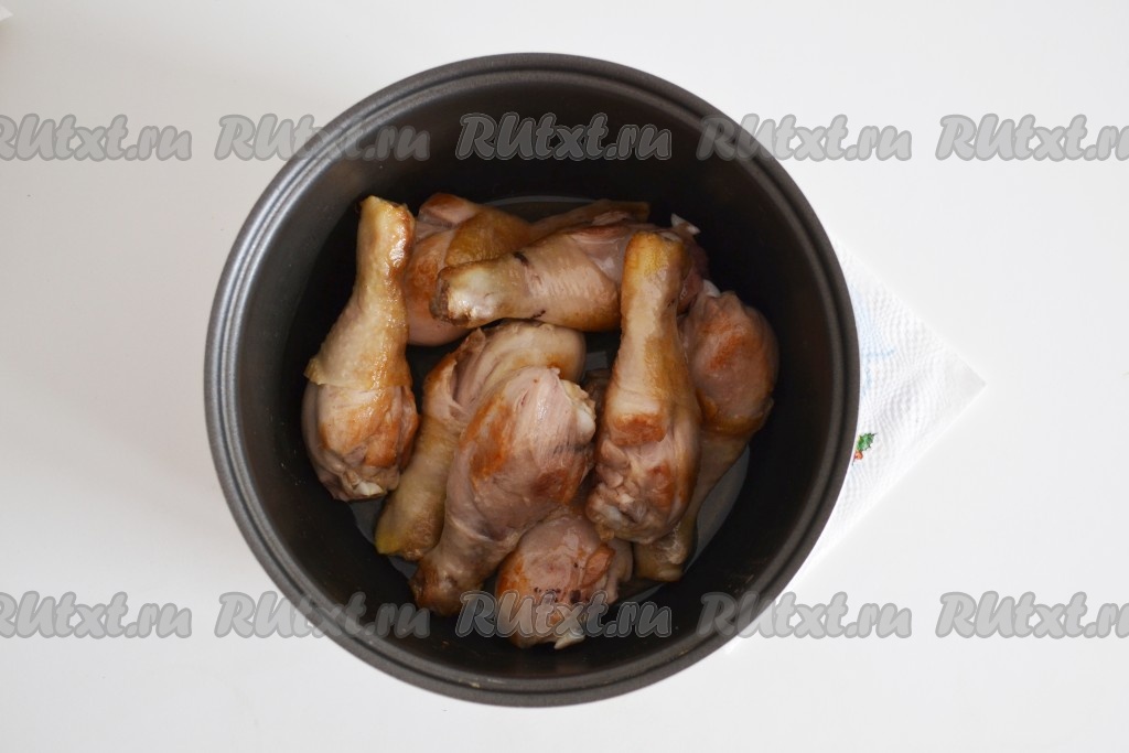 Куриные голени необходимо вымыть проточной водой, выщипать имеющиеся перья, посолить и обжарить со всех сторон на функции мультиварки "Жарка" в хорошо разогретом масле в течение 7-10 минут или до образования румяной корочки.