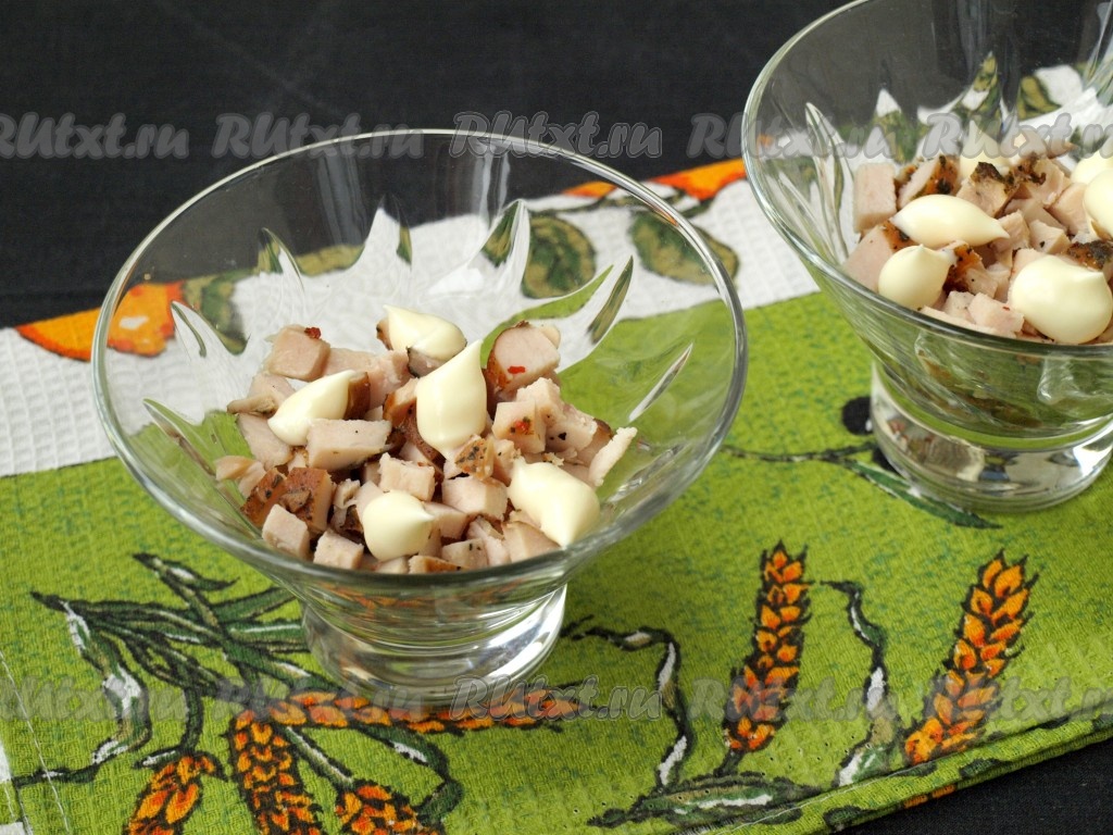 Курицу, нарезанную кубиками, выложить в порционные креманки, смазать майонезом.