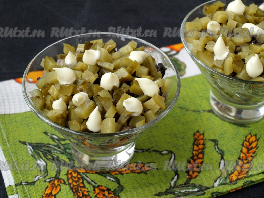 Следующим слоем добавить нарезанные кубиками маринованные огурцы, нанести майонез.