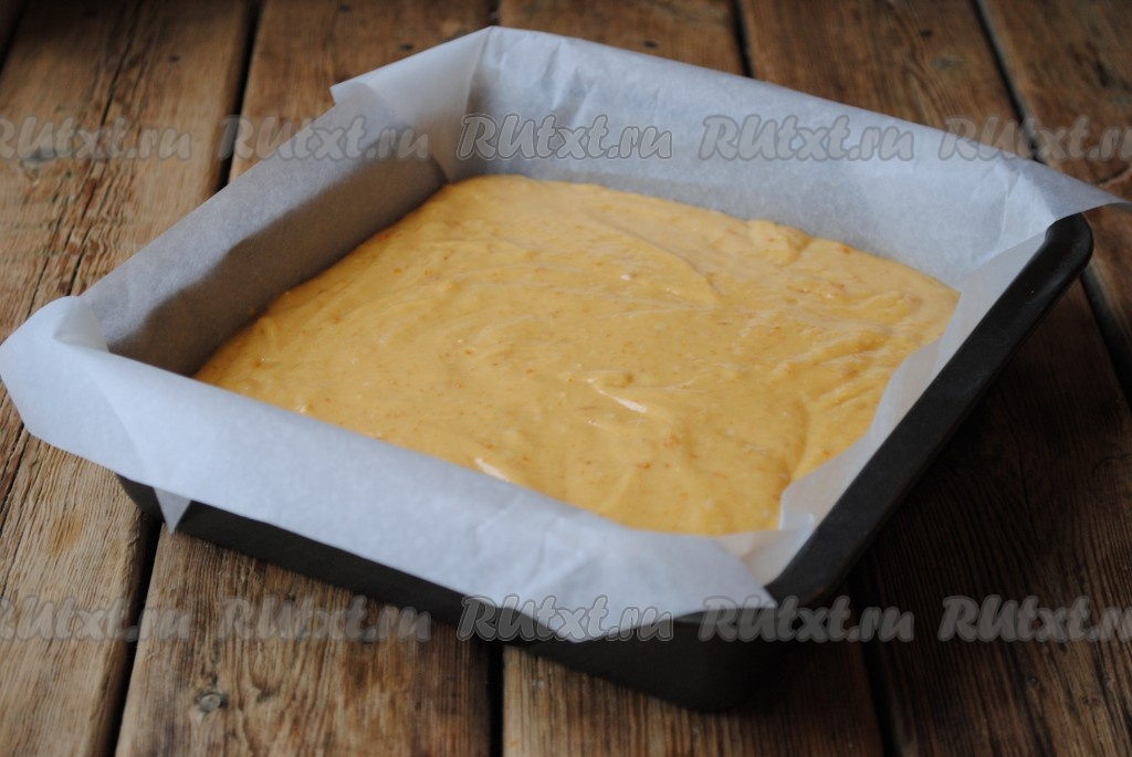 Застелить форму для выпечки пергаментом (у меня размер формы 20х20 сантиметров) и вылить тесто.