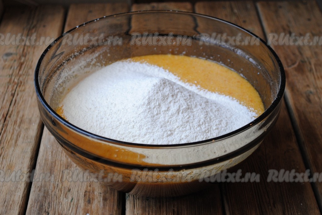 Всыпать частями просеянную муку и ещё раз хорошо перемешать.