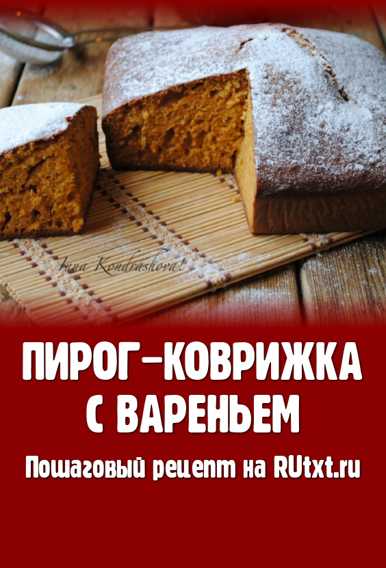 Достать из духовки, вынуть из формы и остудить на решётке, чтобы низ выпечки не подмок. Пирог-коврижка с вареньем получается ароматным и очень вкусным, при подаче его можно посыпать сахарной пудрой и подать с чашечкой чая или молока.