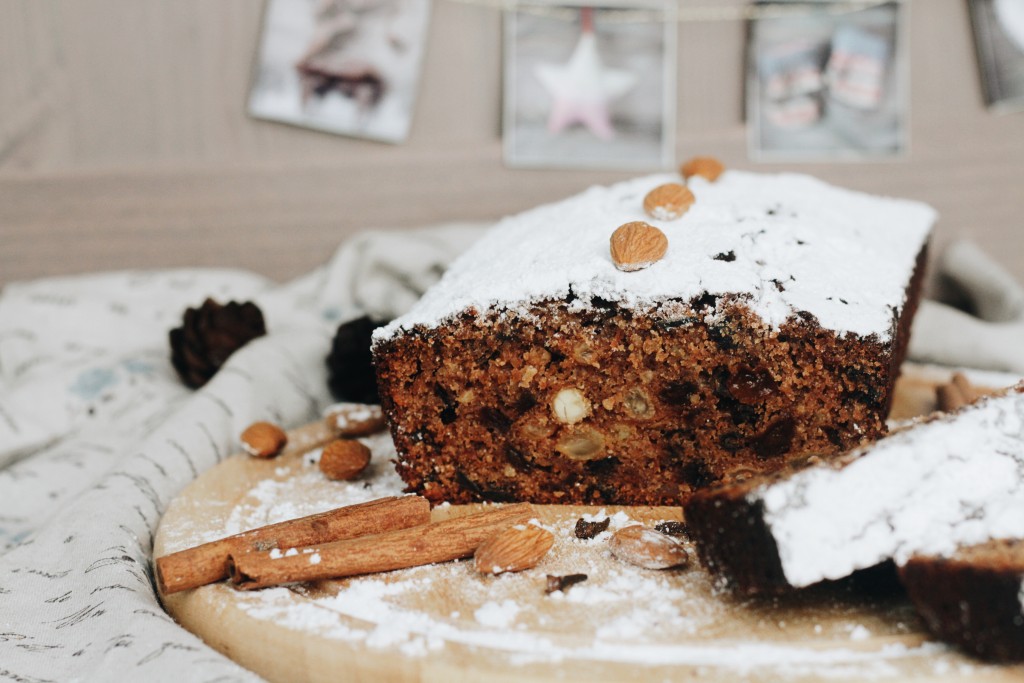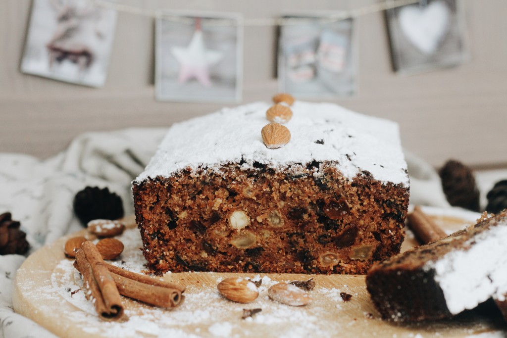 Когда рождественский кекс с сухофруктами полностью остынет, достать из формы и посыпать сахарной пудрой.