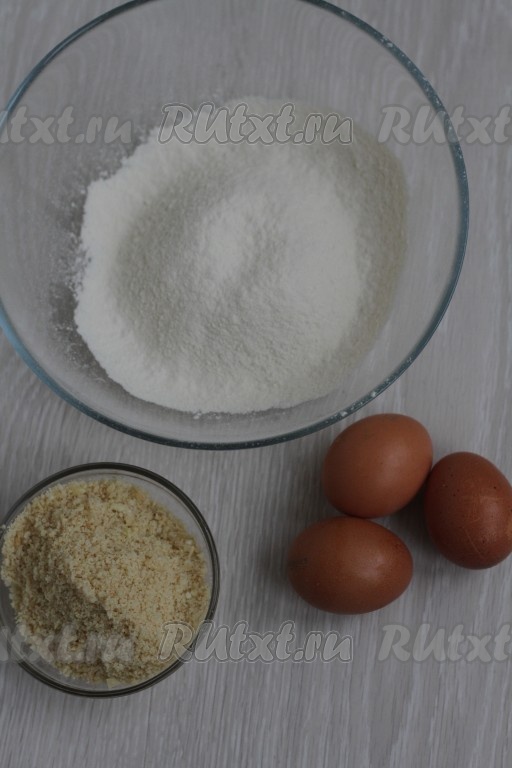 Просеять муку с разрыхлителем, добавить молотый миндаль, яйца, хорошо перемешать получившееся тесто.
