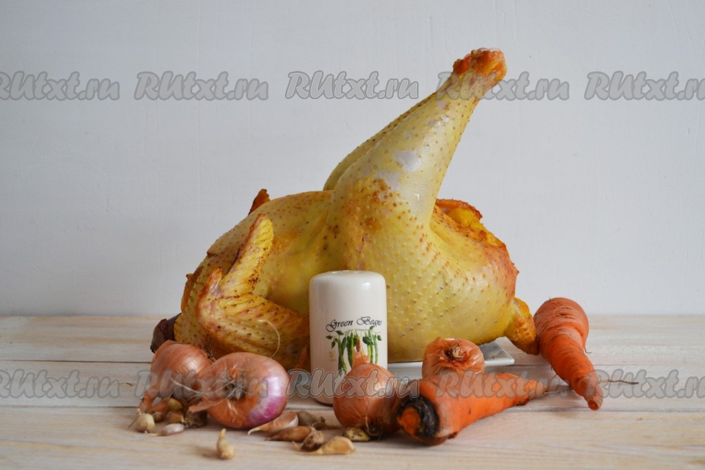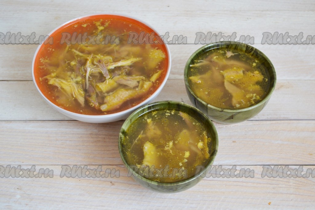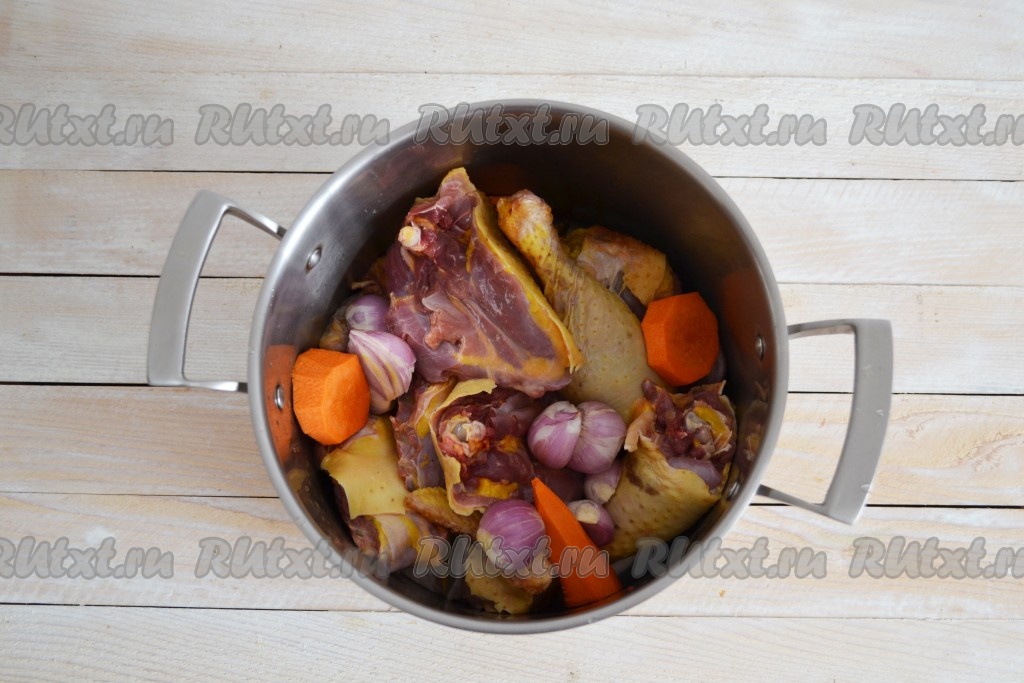 Довести бульон до кипения и снизить к минимуму огонь. Бульон должен слабо кипеть, продолжать варить 2,5 часа. За это время мясо хорошо сварится, будет легко отходить от костей, бульон станет насыщенным и очень ароматным. Затем добавить соль, черный молотый перец, душистый молотый перец и 2-3 очищенных зубчика чеснока. Протомить еще 30 минут на маленьком огне, выключить огонь и оставить остывать.