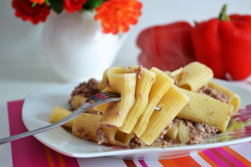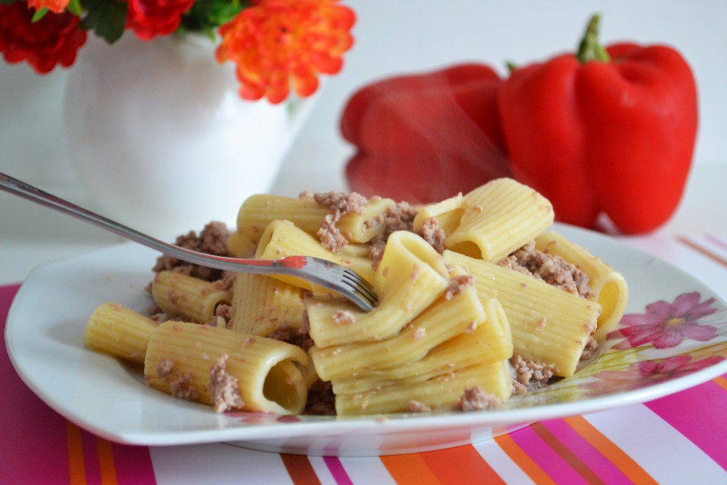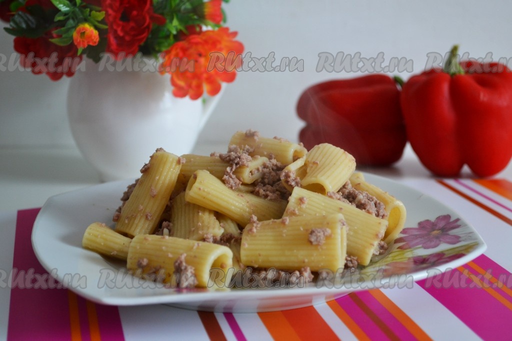 По окончанию приготовления перемешать макароны с фаршем и подать на стол в теплом виде.