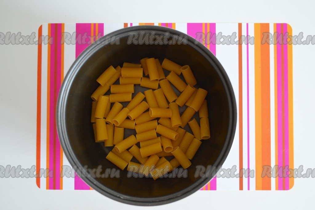В чашу мультиварки выложить макароны. Лучше использовать качественные макароны твердых сортов. Они вкусные и хорошо держат первоначальную форму, не развариваются.