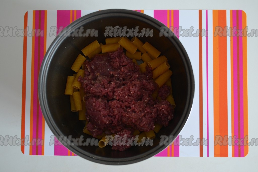 Выложить в чашу мультиварки на макароны свежий фарш.