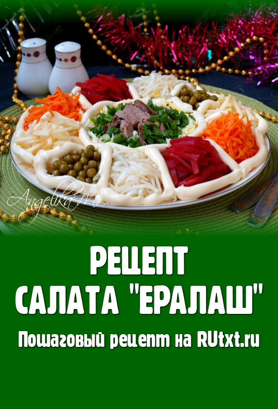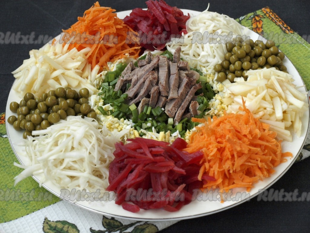 Салат "Ералаш" относится к тем салатам, которые выкладываются продуктовыми горочками и в таком виде подаются к столу. Салат перемешивается непосредственно перед употреблением, а до этого украшает стол своим ярким и привлекательным видом. В этом рецепте салата "Ералаш" используется отварная говядина, яйца, яблоко, а из овощей - свекла, морковь, капуста, зелёный лук и горошек. Очень вкусный салат, советую!