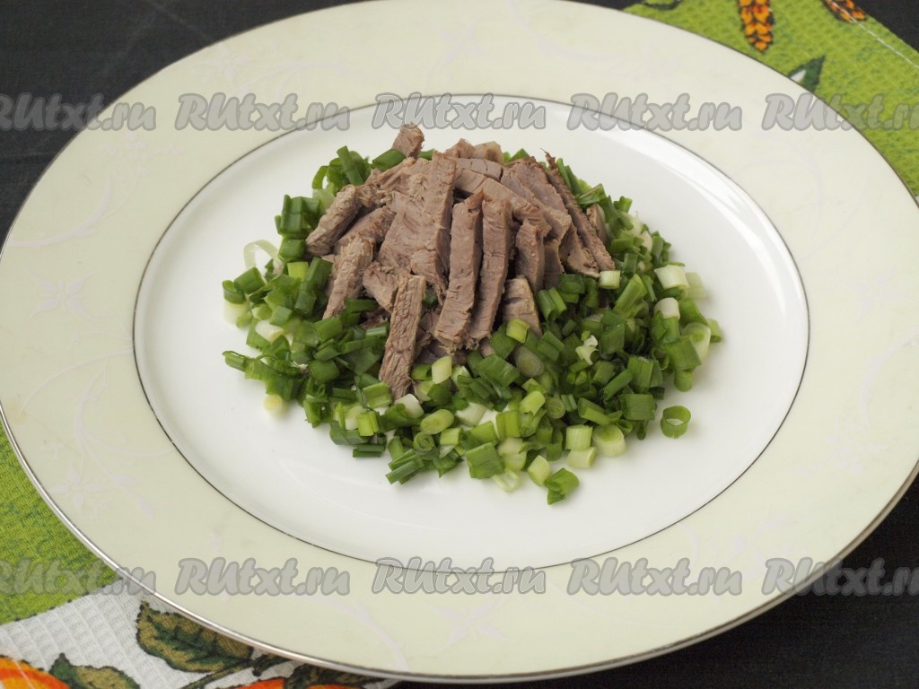 Говядину нарезать соломкой. Зелёный лук измельчить. В центр большого блюда горкой выложить мясо, вокруг разместить зелёный лук.