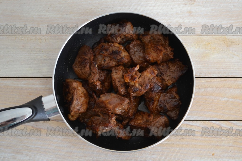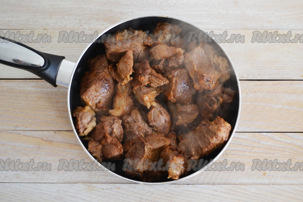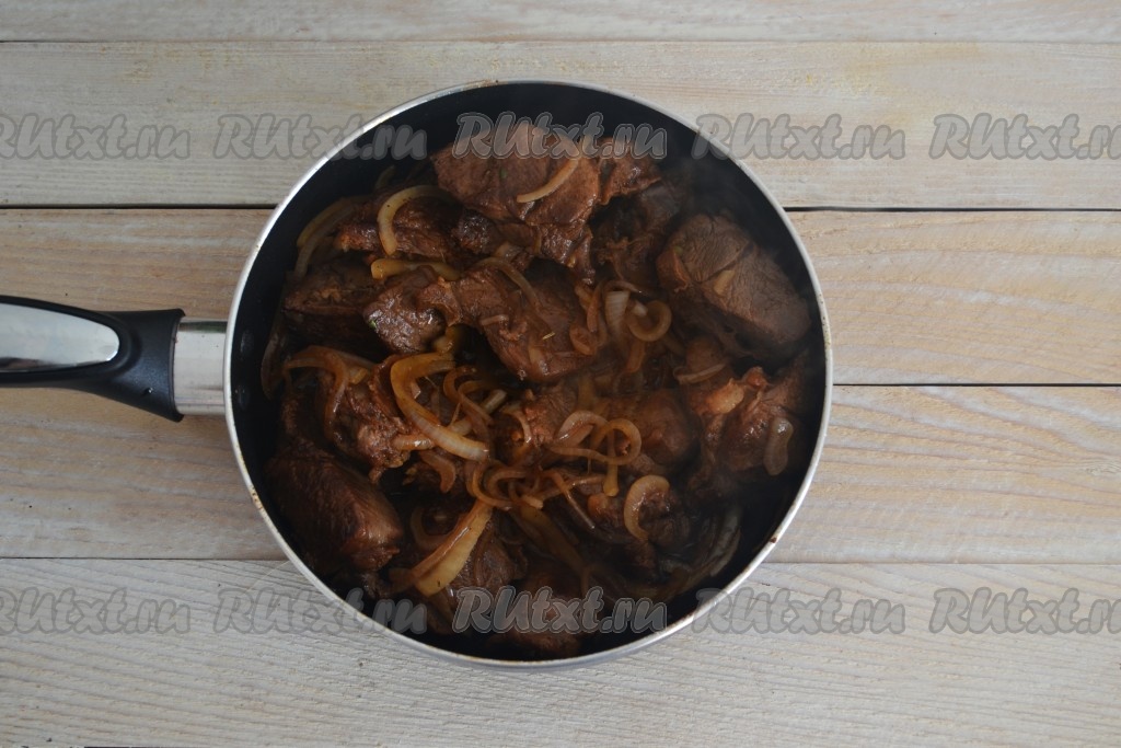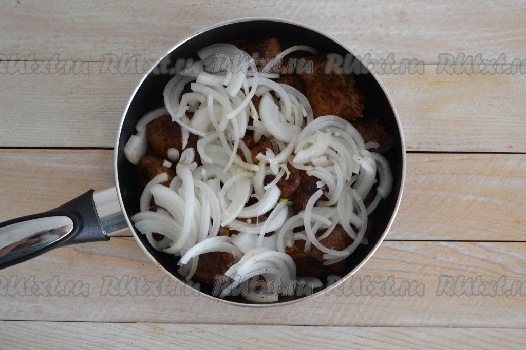 Выложить лук на сковороду поверх баранины и обжарить до состояния мягкости лука (это займет 1-2 минуты).