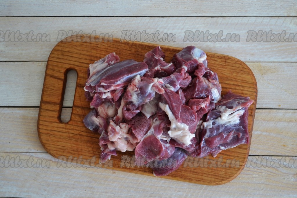 Баранину хорошо вымыть, если нужно, обдать огнем для удаления остатков шерсти. Срезать мякоть с кости, обрезая пленочку и прожилки. Нарезать мясо небольшими кусочками, примерно, 4х4 см. Посолить, приправить специями и перемешать, массируя руками каждый кусочек.