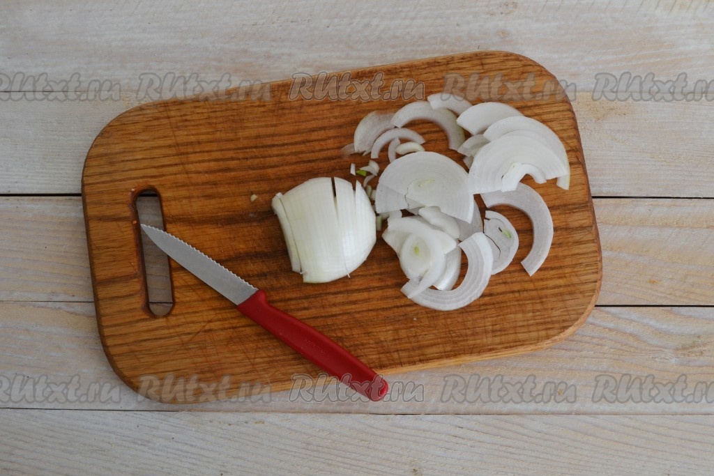 Лук очистить, вымыть и нарезать тонкими полукольцами.